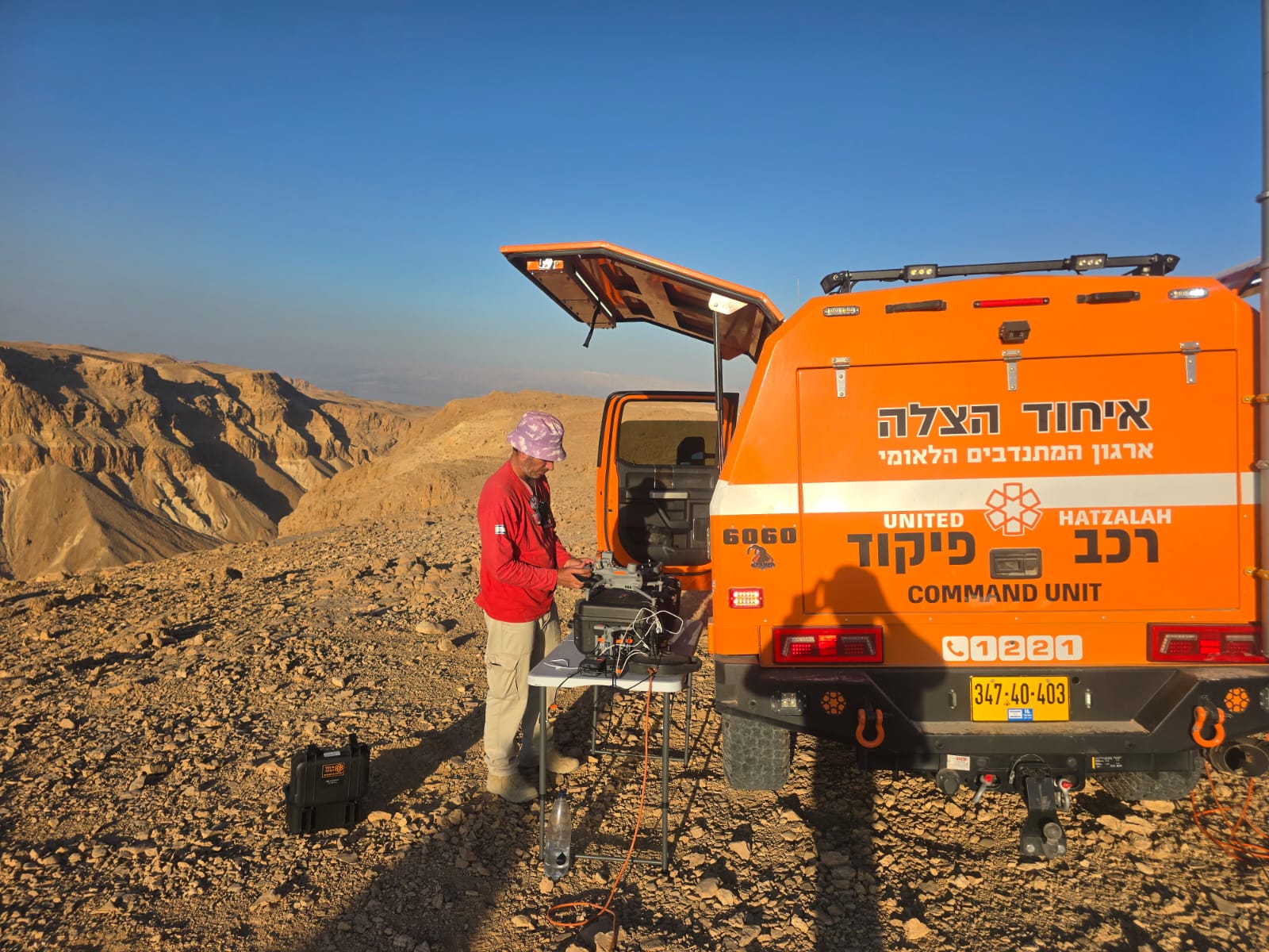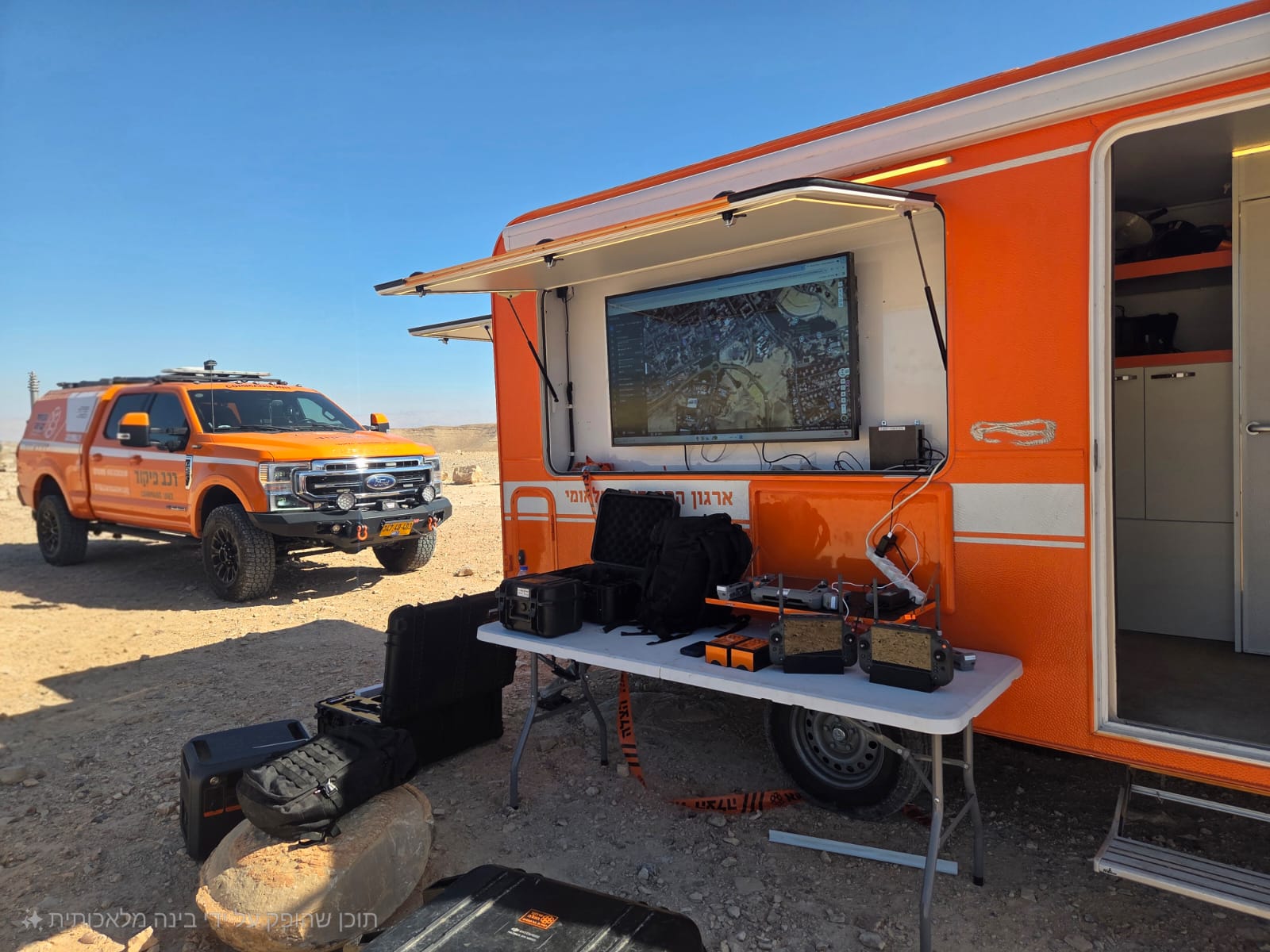 בנוסף, נפרס חפ"ק שטח מתקדם ובו ציוד טכנולוגי לניתוח תצלומי האוויר ותכנון מסלולי הסריקה. רכב פיקוד 4X4 ייעודי אפשר למתנדבים להגיע לעומק השטח לנקודות ההטסה שנבחרו, ולהפעיל את הרחפנים לאורך זמן הודות למערכות טעינה חדישות.