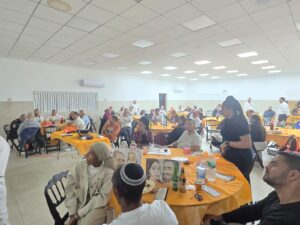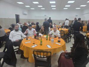 המתנדבים ישבו סביב שולחנות לארוחת ערב בשרית חגיגית ונהנו מערב מהנה עם תכניות מושקעות אל תוך הלילה
